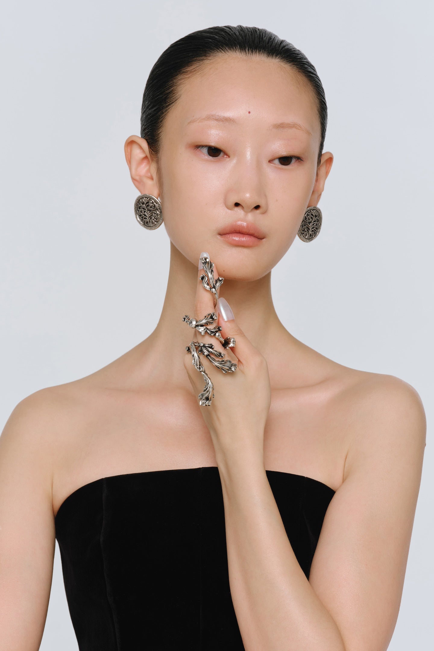 Introducing the Apple Twig Ring Long Edition- Clear Stone by ANCIENT FUTURE – a beautiful, handmade pair crafted with brass. With its intricate design and symbolic texture, this accessory transforms the essence of nature into a wearable piece of art, embodying the brand's commitment to capturing mythic elements in every piece.