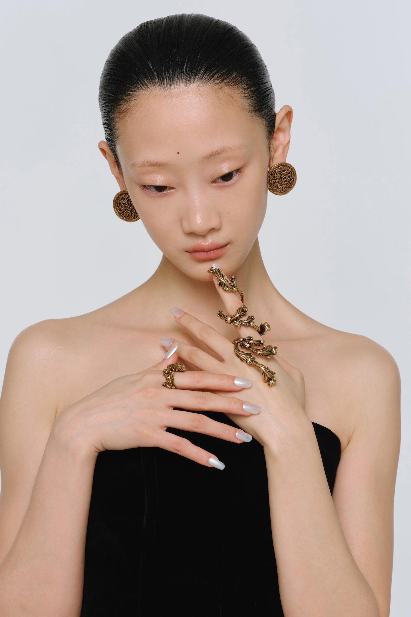 Introducing the Apple Twig Ring Long Edition by ANCIENT FUTURE – a beautiful, handmade pair crafted with brass. With its intricate design and symbolic texture, this accessory transforms the essence of nature into a wearable piece of art, embodying the brand's commitment to capturing mythic elements in every piece.