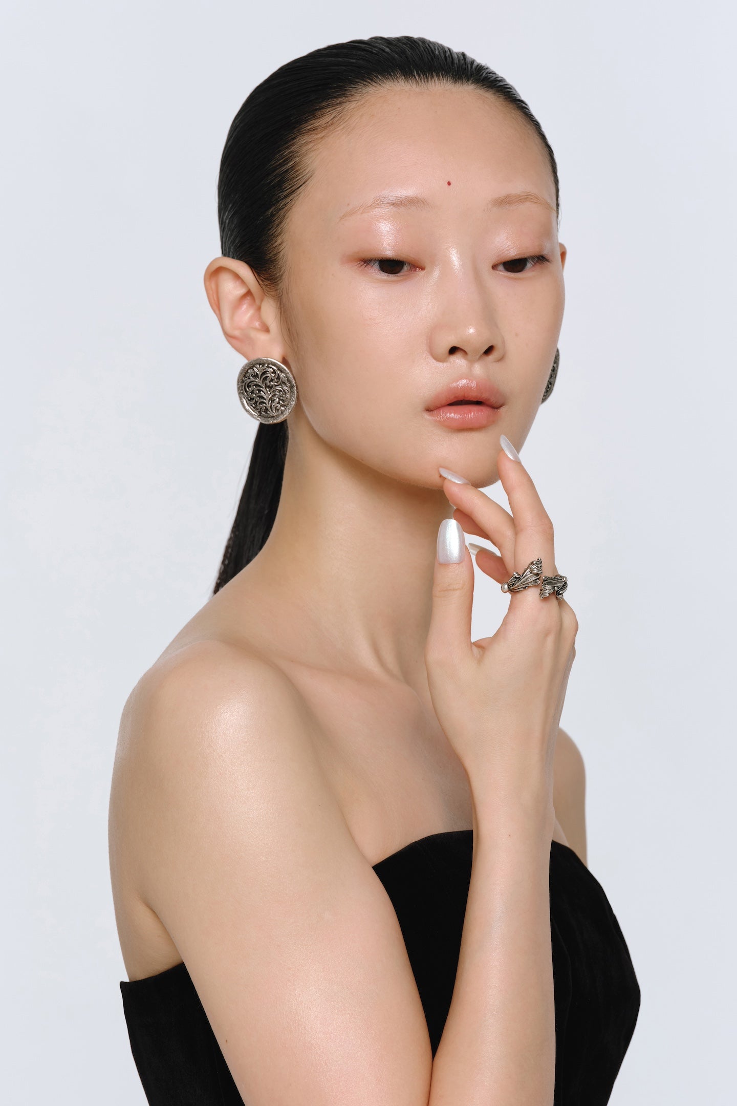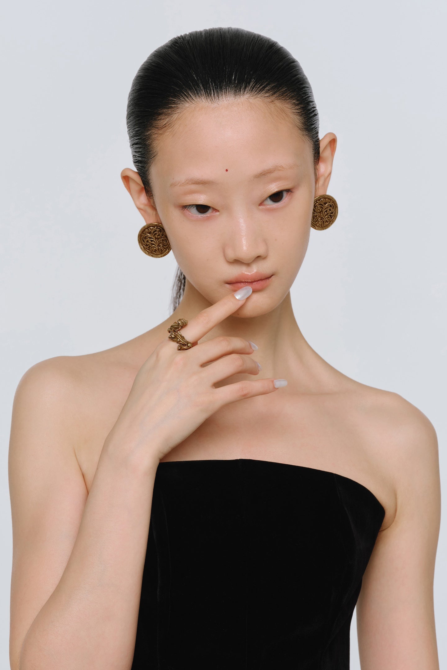 Introducing the Apple Twig Ring Short Edition by ANCIENT FUTURE – a beautiful, handmade pair crafted with brass. With its intricate design and symbolic texture, this accessory transforms the essence of nature into a wearable piece of art, embodying the brand's commitment to capturing mythic elements in every piece.
