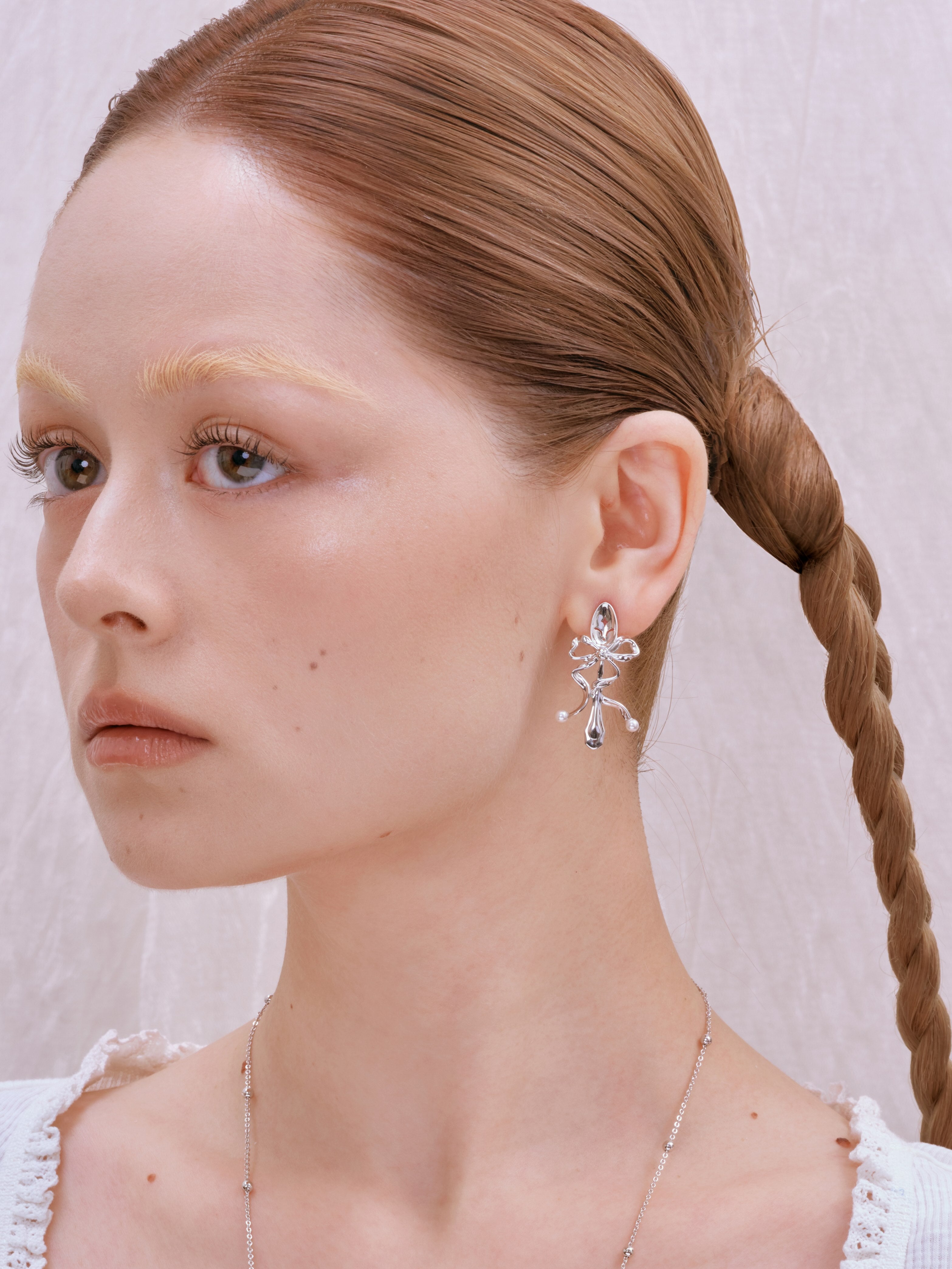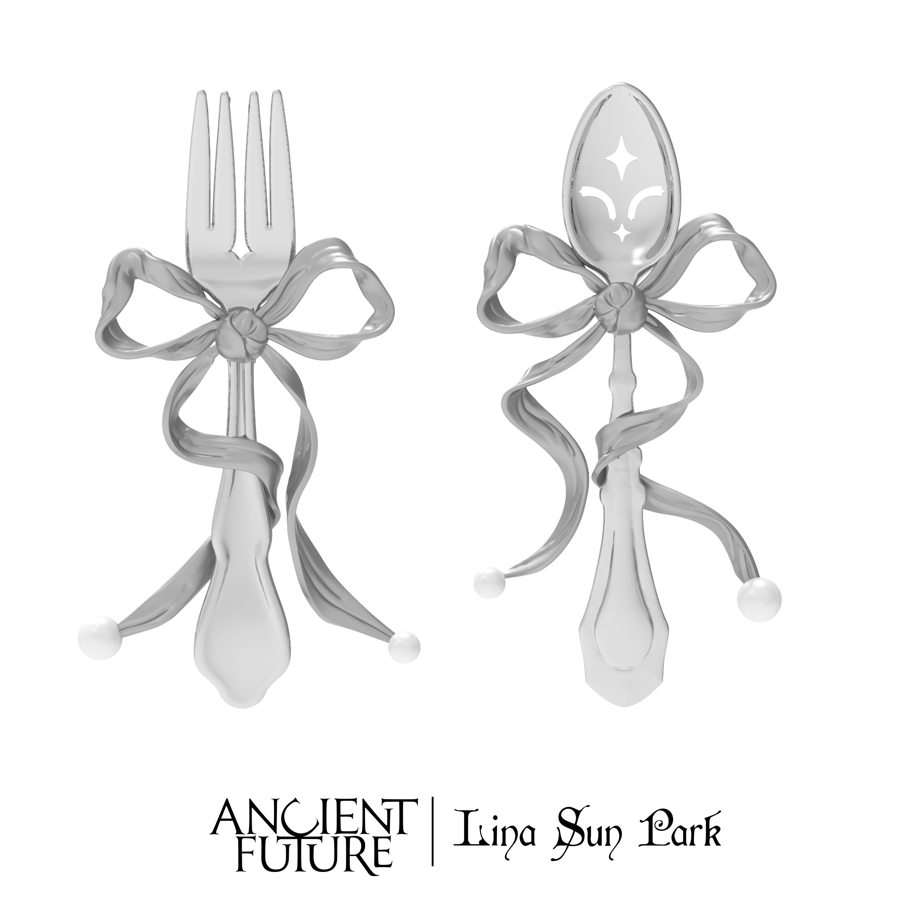 The Fork & Spoon Ribbon Earrings by ANCIENT FUTURE are a handcrafted pair made with Brass-Plating White Gold and Glass Pearl. The sculptural ribbon form is paired with the soft luster of glass pearls, creating a refined contrast that reflects the brand’s approach to turning everyday-inspired motifs into wearable art.