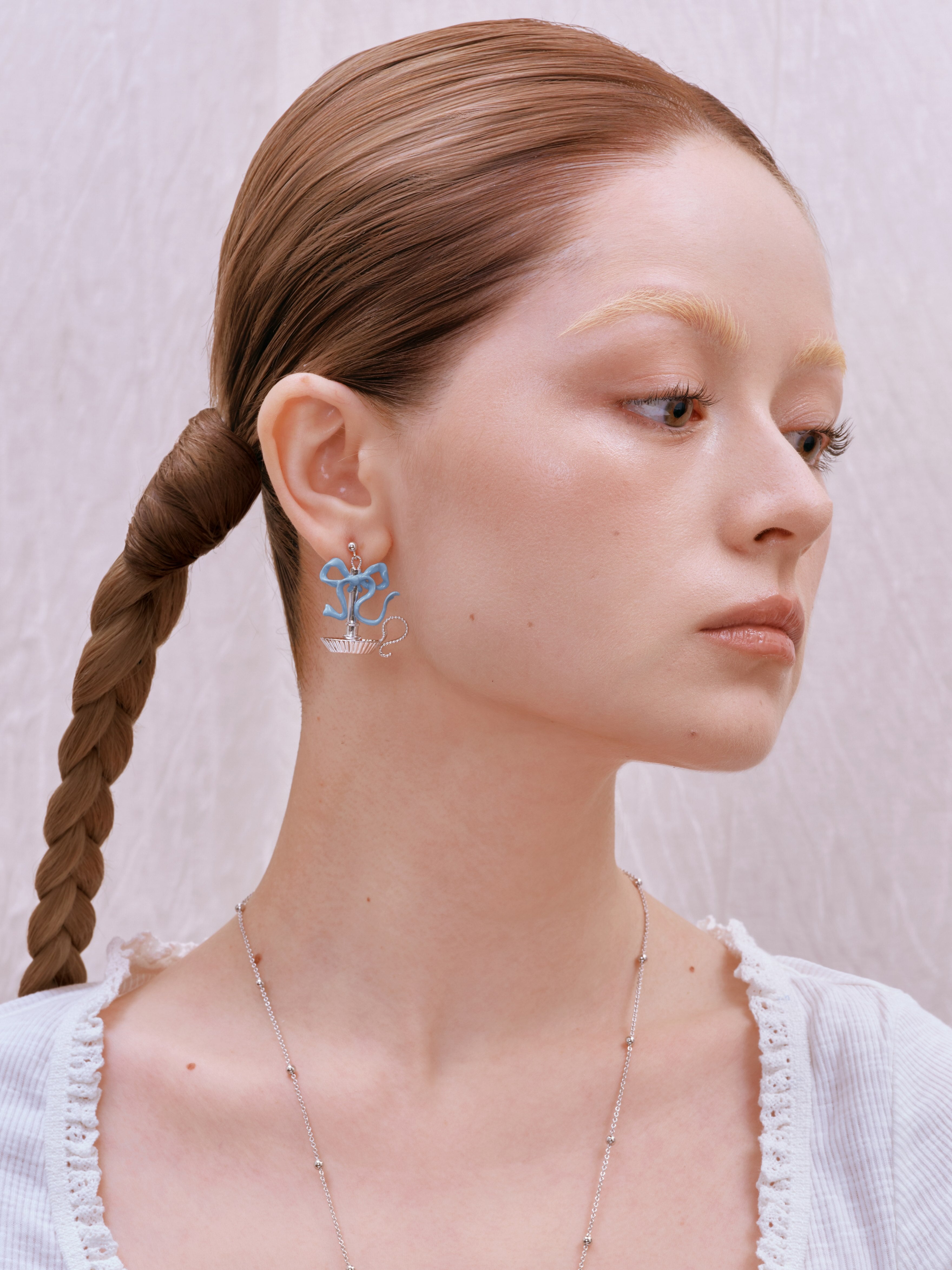 The Candlelight Ribbon Earrings by ANCIENT FUTURE are a handcrafted pair made with Brass-Plating White Gold and Enameling. The flowing ribbon form is combined with a soft metal sheen and delicate enamel detailing, creating a calm and elegant expression that reflects the brand’s approach to transforming poetic imagery into wearable art.