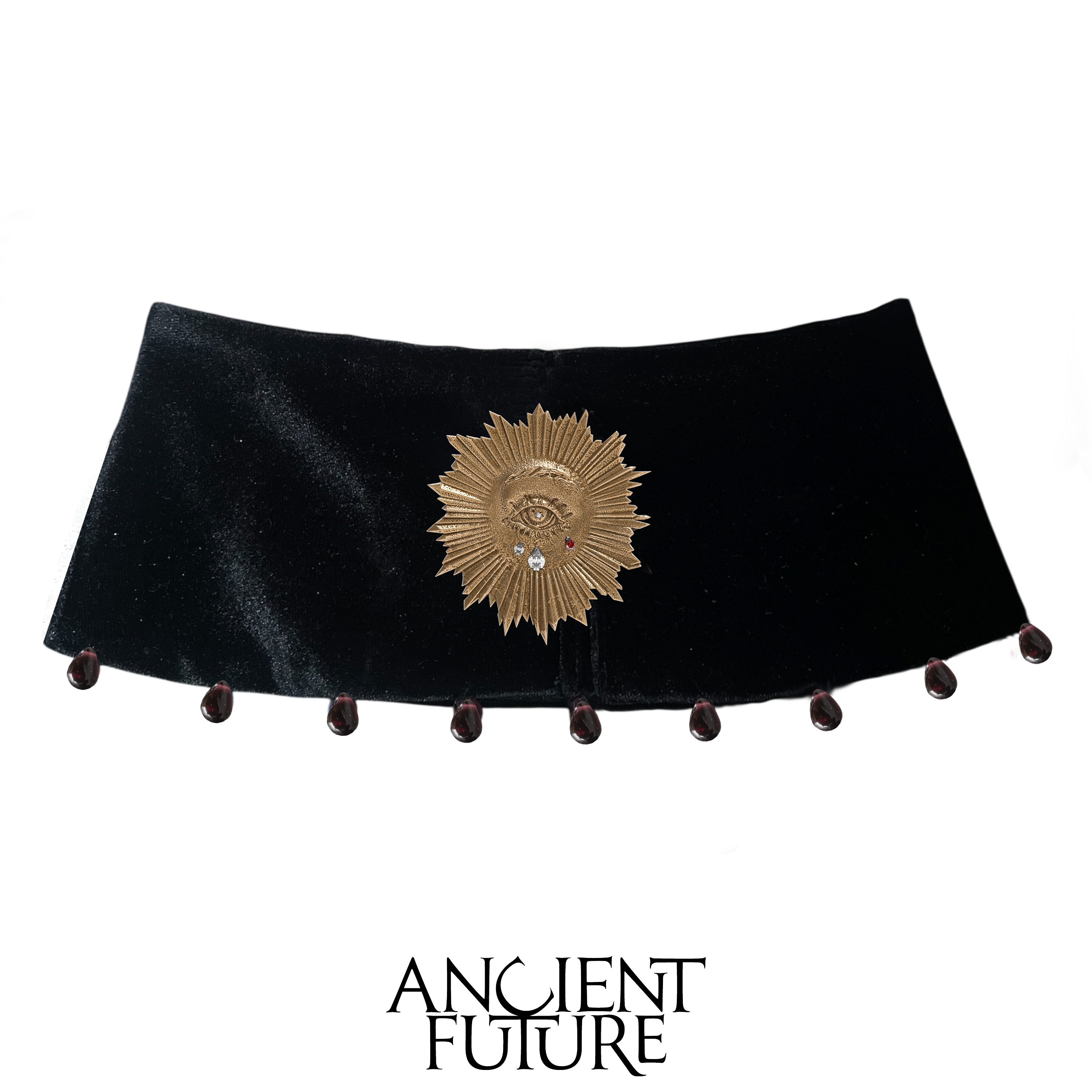 Introducing the Eye of Prayer Brooch/Velvet Chocker by ANCIENT FUTURE – a beautiful, handmade pair crafted with brass. With its intricate design and symbolic texture, this accessory transforms the essence of nature into a wearable piece of art, embodying the brand's commitment to capturing mythic elements in every piece.