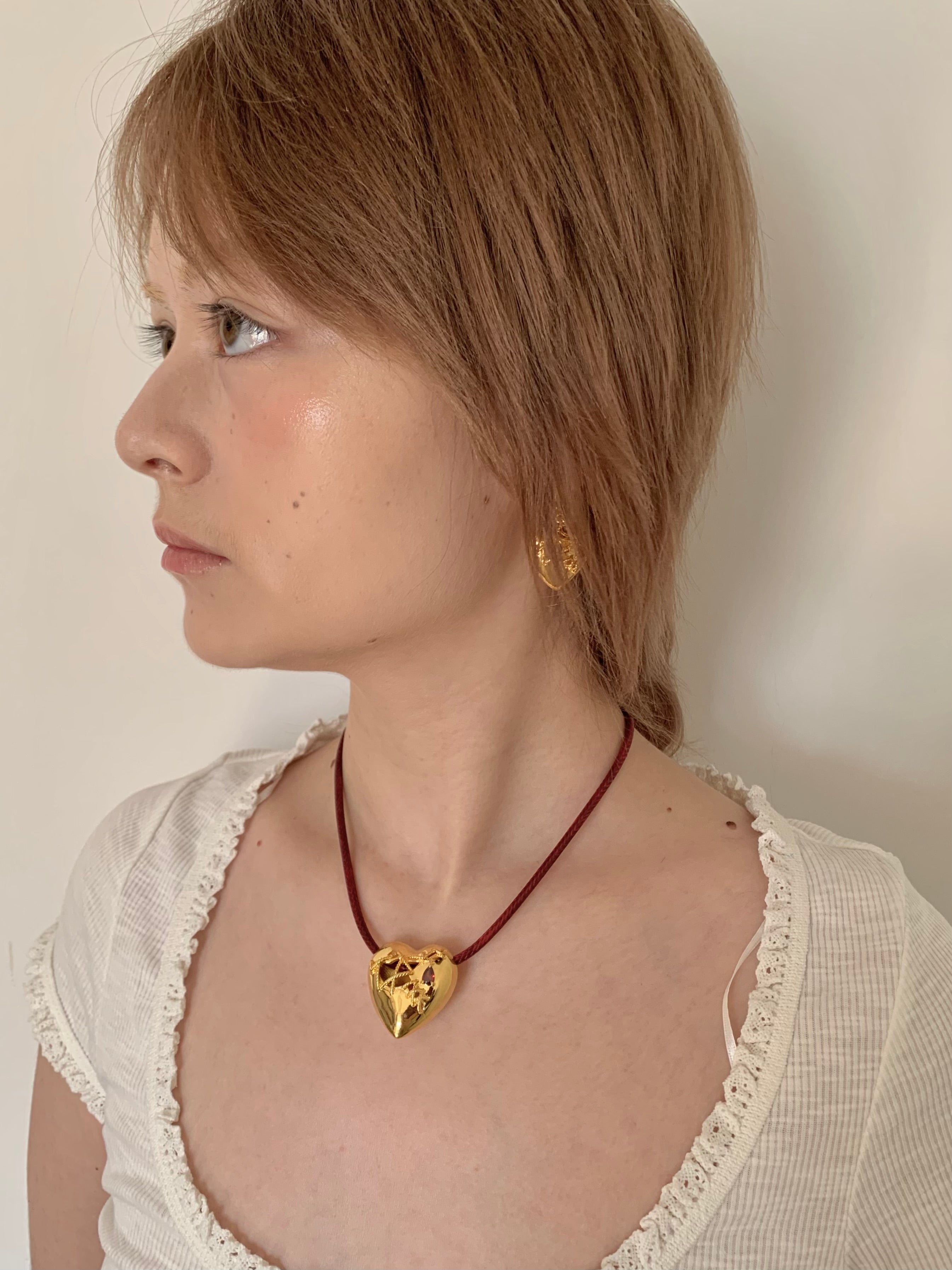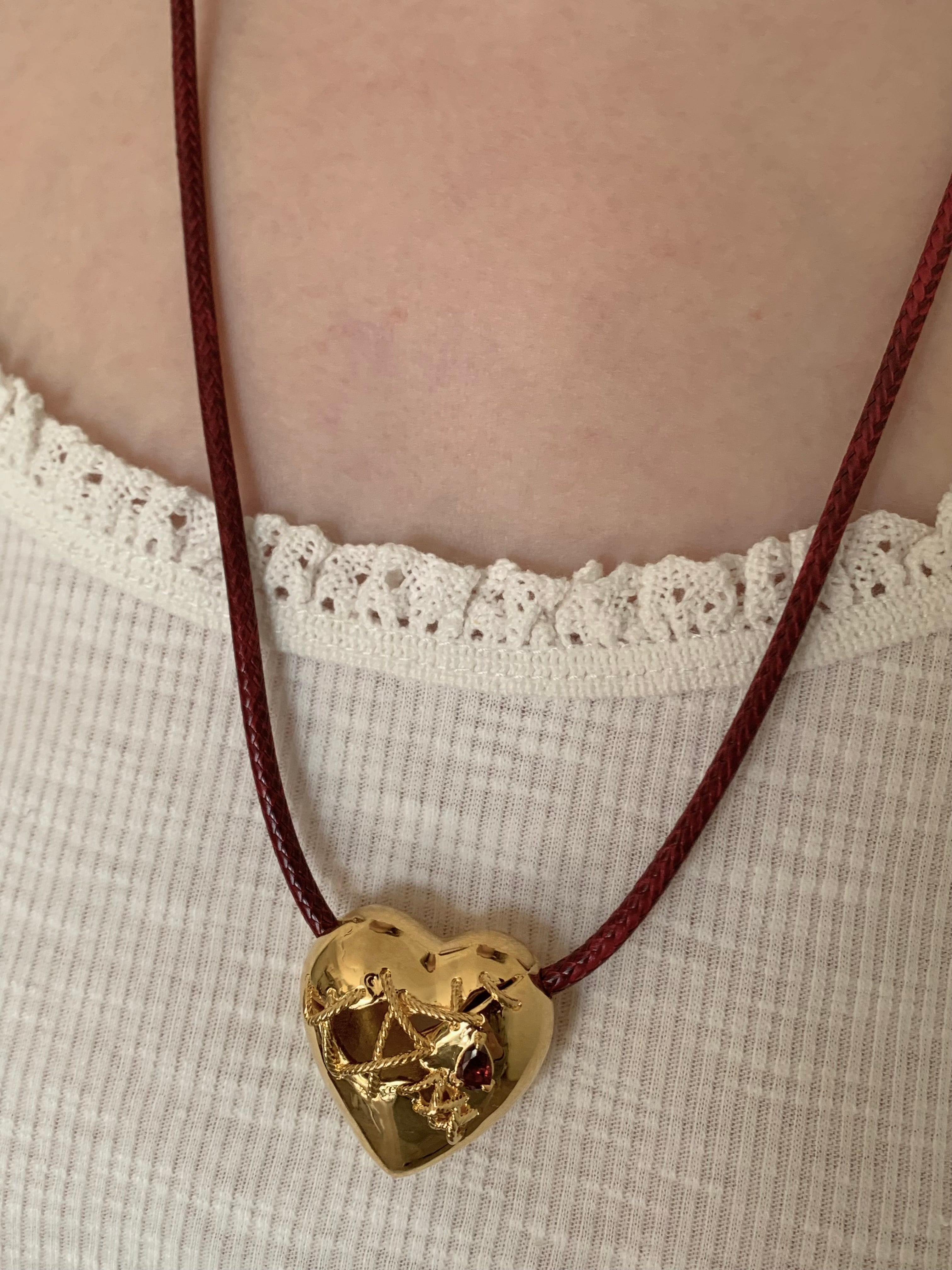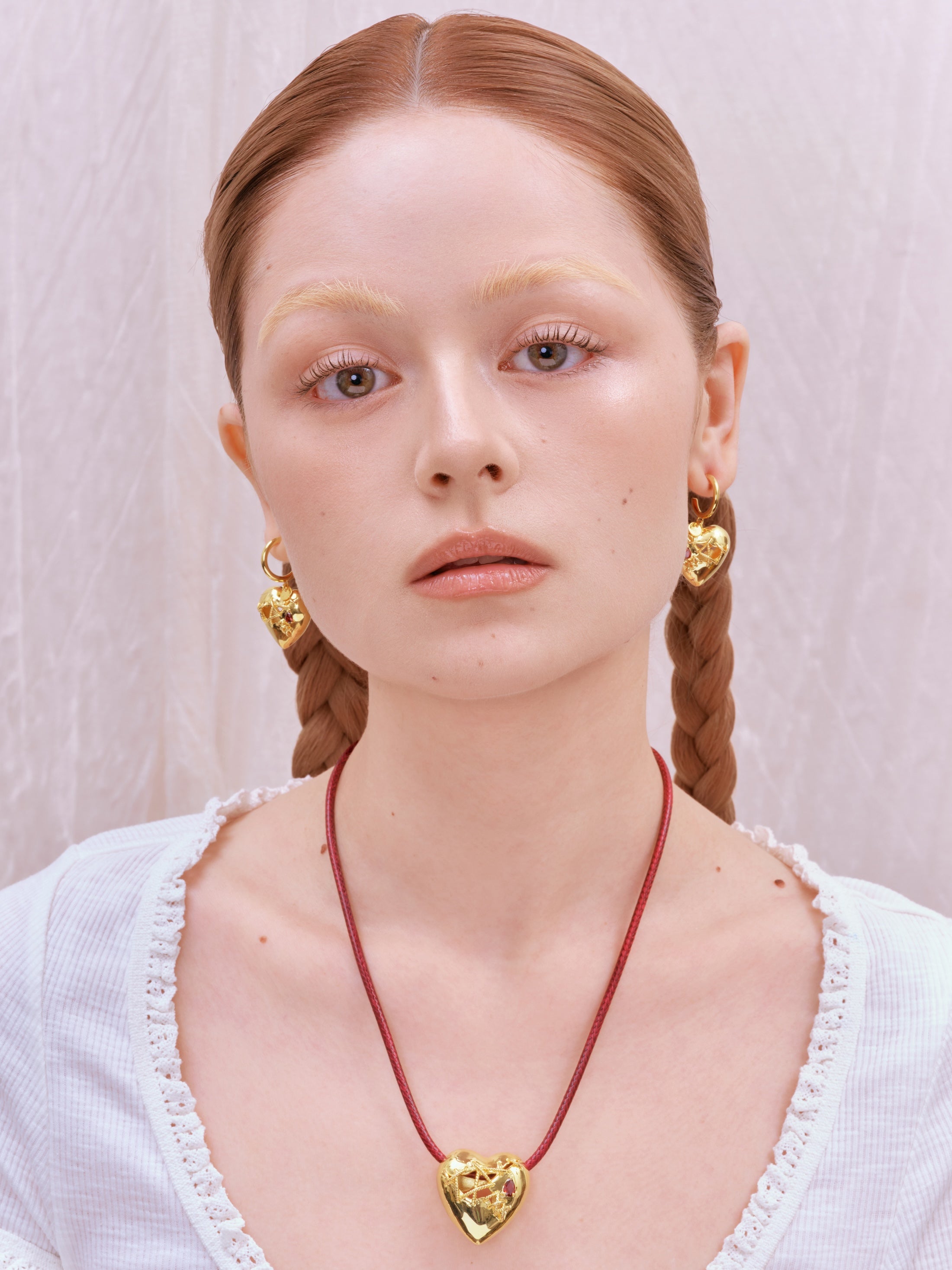 The Healing Heart Leather String Necklace by ANCIENT FUTURE is a handcrafted necklace made with Brass-Plating 18k Gold, Artificial Zircon, and a leather string. The contrast between polished metal, zircon accents, and the soft leather cord creates a balanced and understated design, reflecting the brand’s approach to transforming symbolic forms into wearable art.