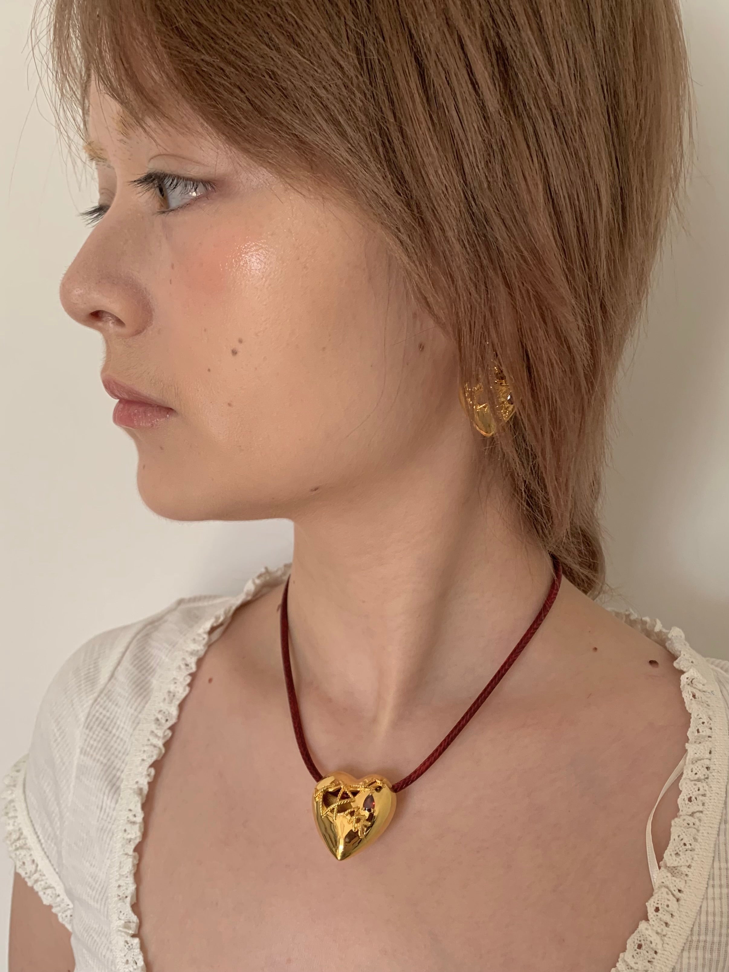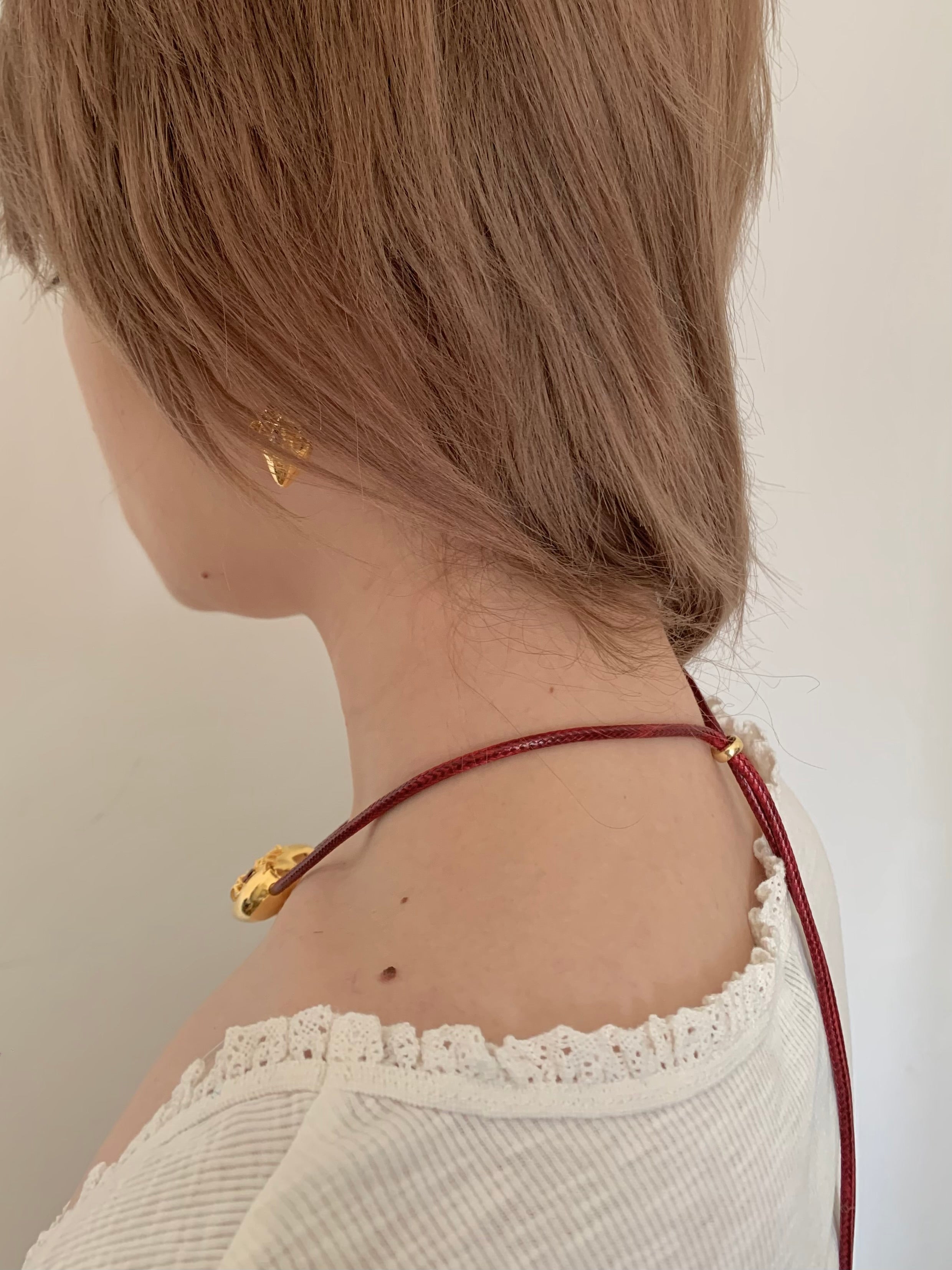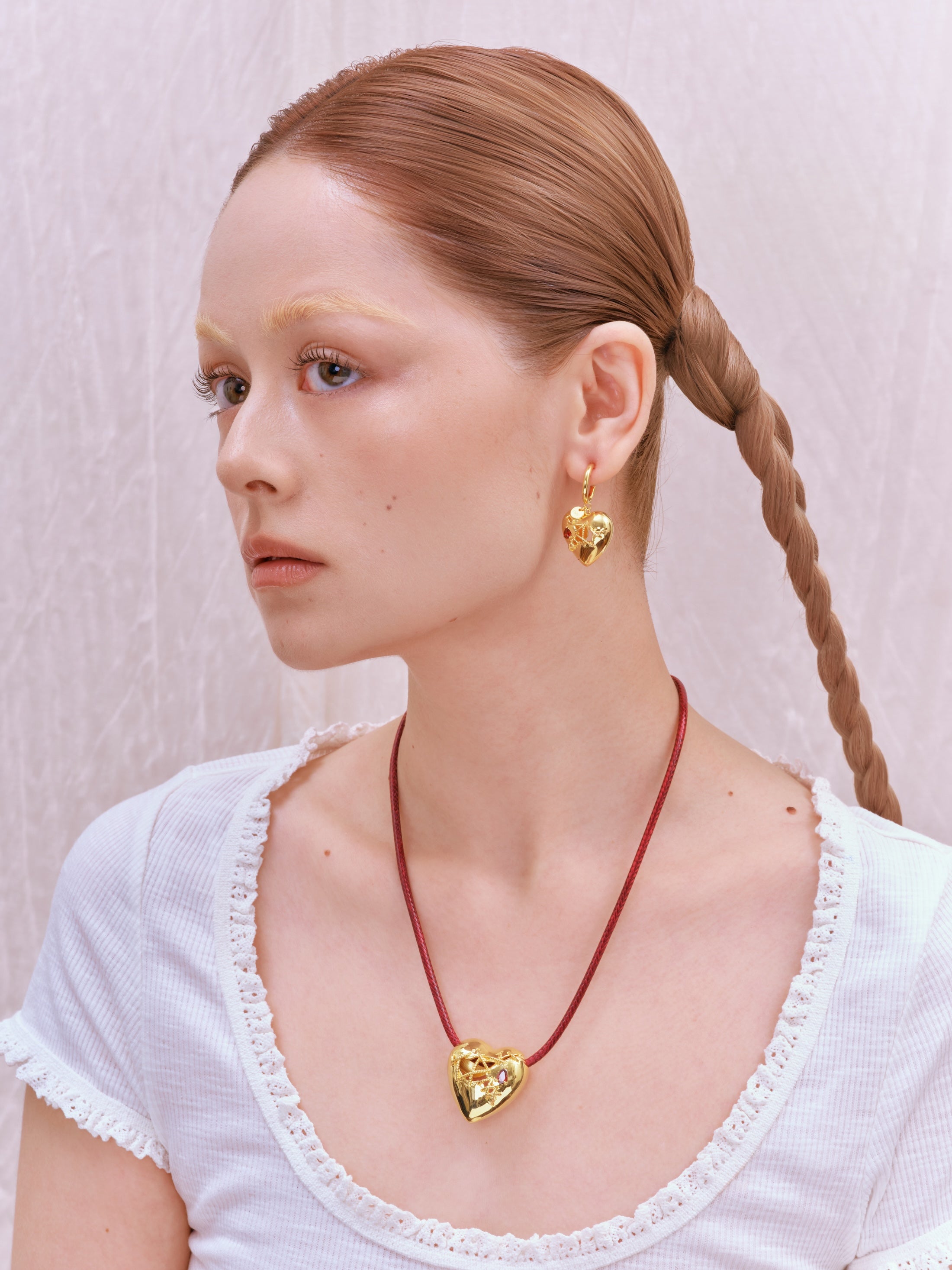 The Healing Heart Leather String Necklace by ANCIENT FUTURE is a handcrafted necklace made with Brass-Plating 18k Gold, Artificial Zircon, and a leather string. The contrast between polished metal, zircon accents, and the soft leather cord creates a balanced and understated design, reflecting the brand’s approach to transforming symbolic forms into wearable art.