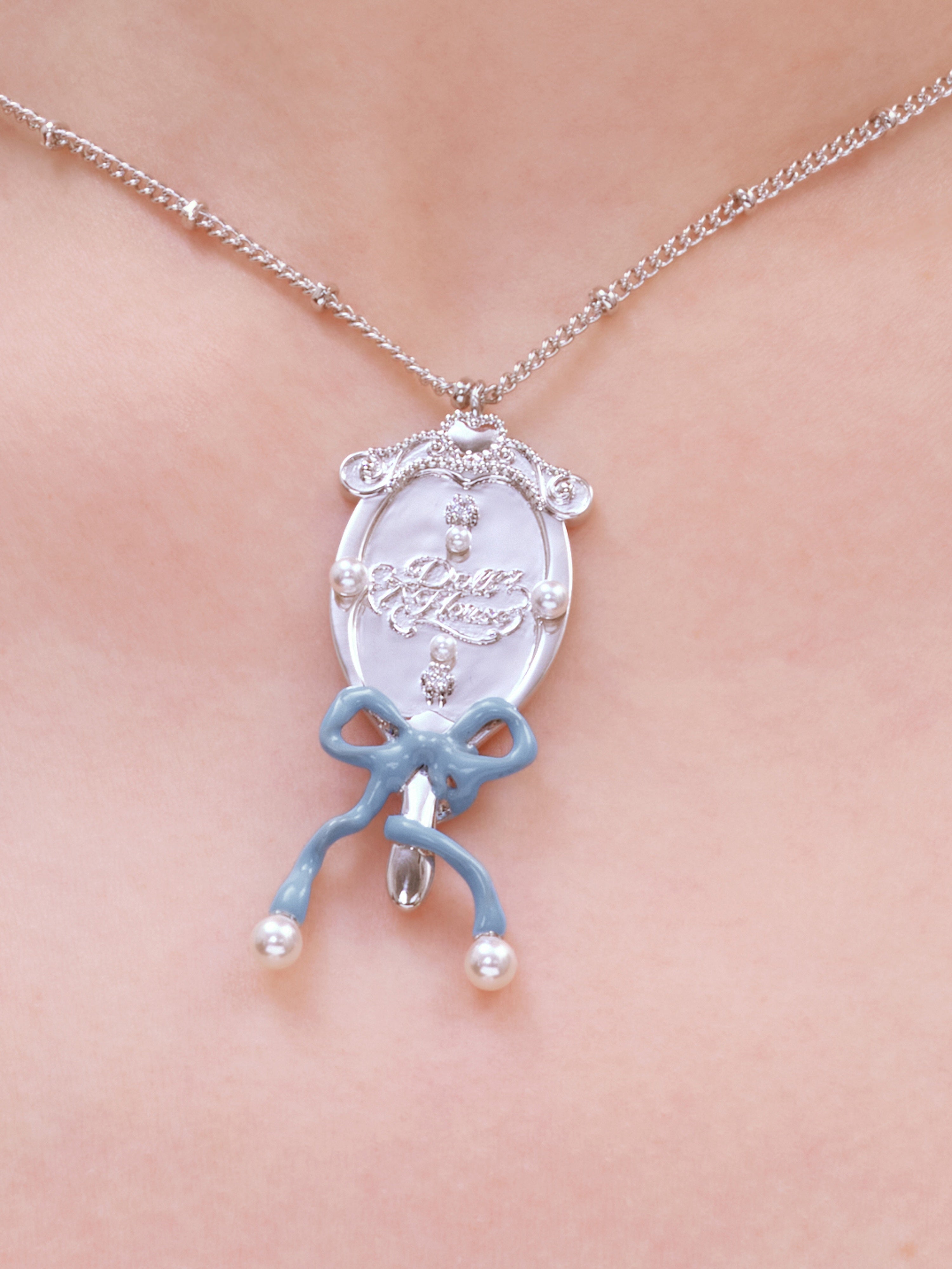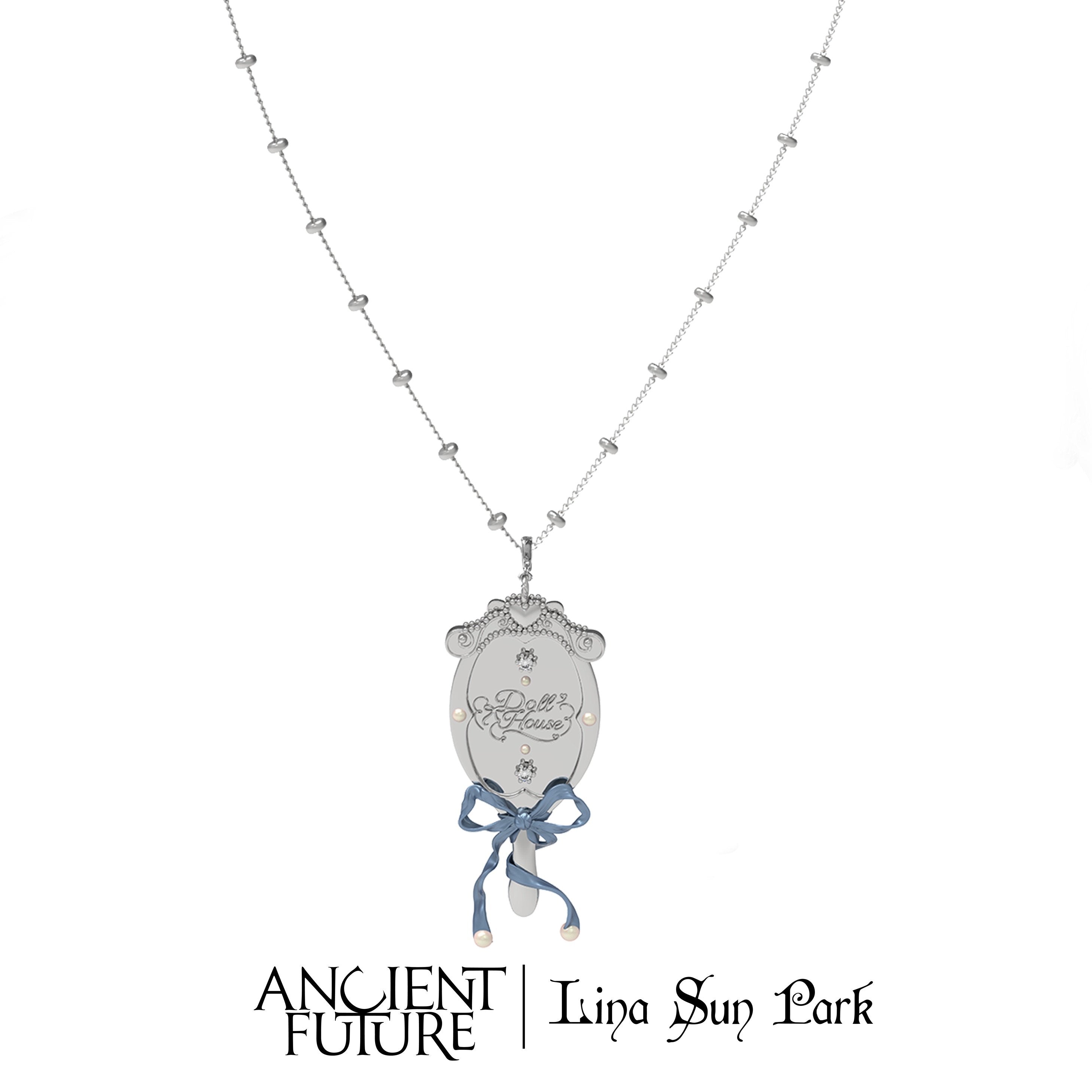 The Mirror Necklace by ANCIENT FUTURE is a handcrafted necklace made with Brass-Plating White Gold, Enameling, and Glass Pearl. The polished metal surface is balanced with enamel details and the soft luster of glass pearl, creating a composed and reflective design that embodies the brand’s approach to transforming symbolic objects into wearable art.