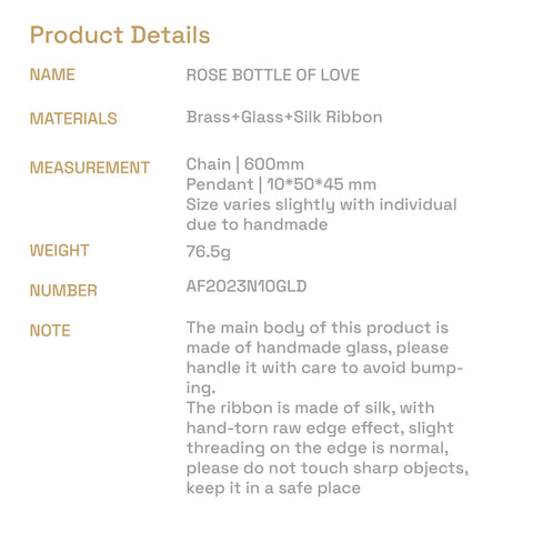 Elevate your look with the ROSE BOTTLE OF LOVE by ANCIENT FUTURE. Crafted with brass, glass, silk ribbon. this handmade necklace showcases the brand's commitment to aesthetic excellence and sustainability. Wear it confidently as a symbol of your connection to nature.