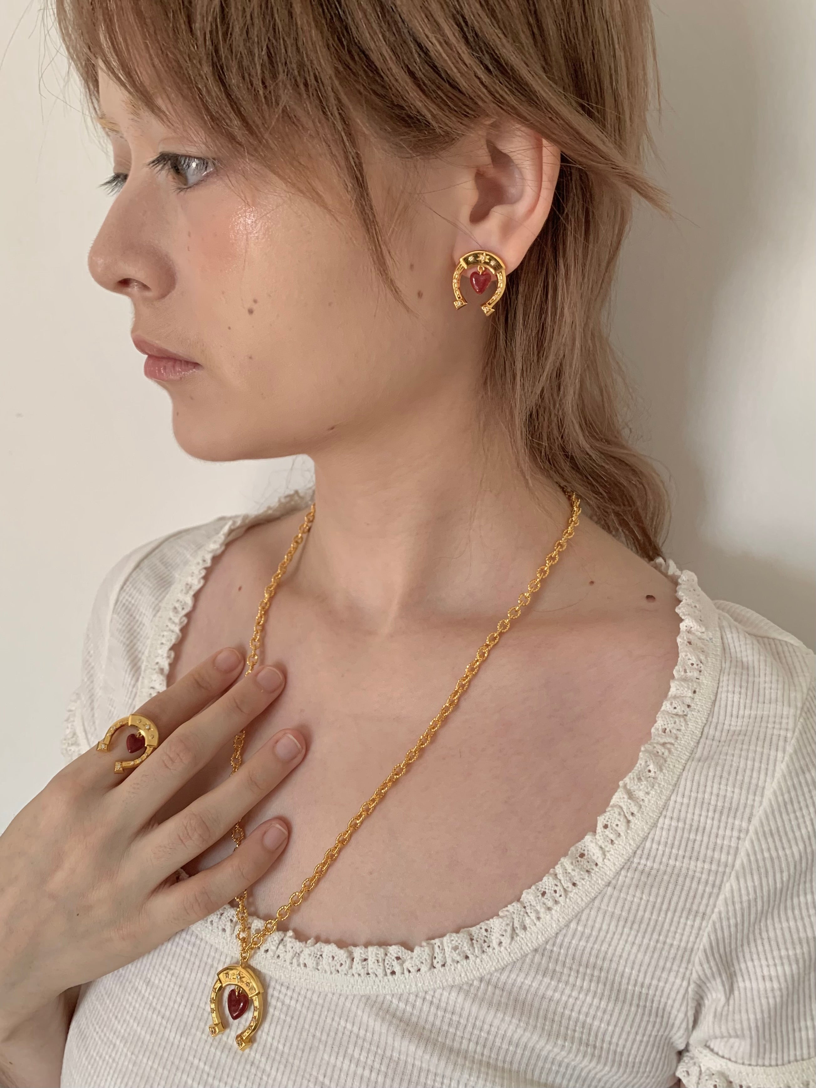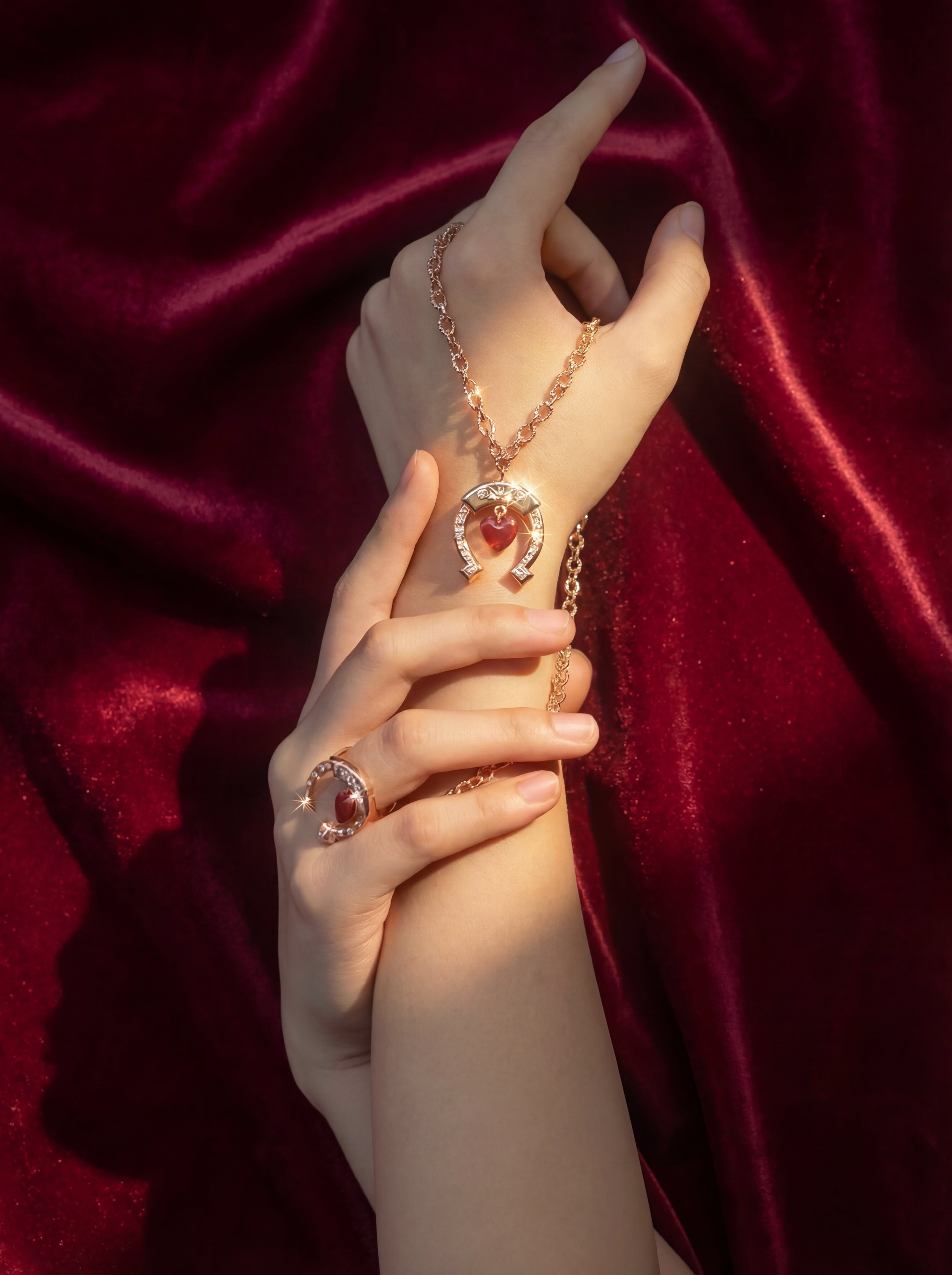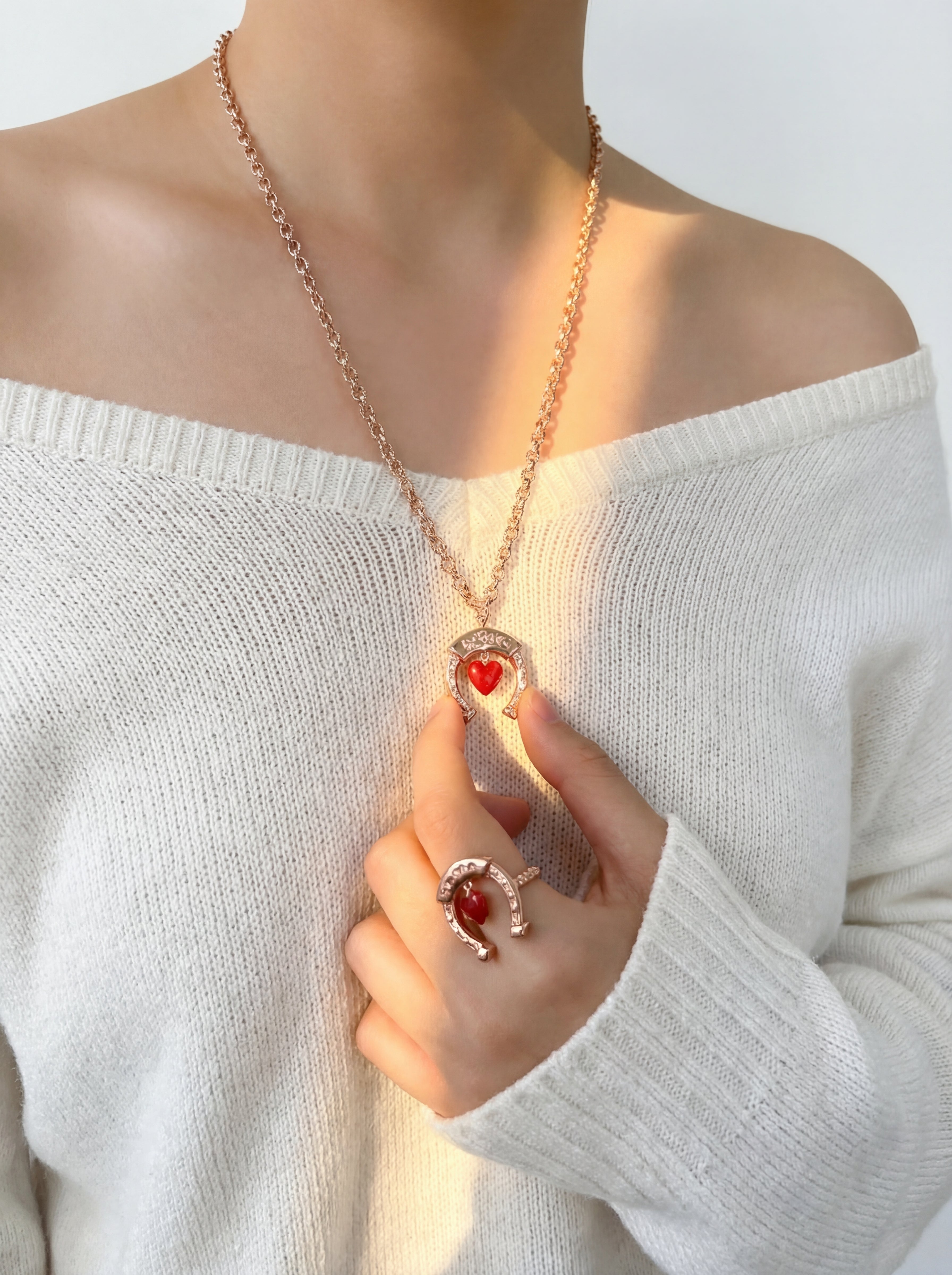 The Fortune Horseshoe Necklace by ANCIENT FUTURE is a handcrafted necklace offered in two material finishes: Brass-Plating White Gold with Artificial Zircon, and Brass-Plating 18k Gold with Artificial Zircon and Enameling. The interplay of metal sheen, zircon accents, and refined craftsmanship reflects the brand’s vision of translating symbolic forms into wearable art.